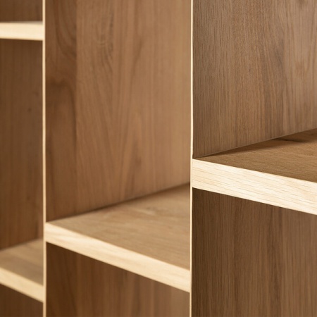 Cette composition angulaire d'étagères Stairs, conçue par Alain van Havre, constitue le cœur d'un design qui vise à se distancier des surfaces statiques et immobiles traditionnelles. En alignant parfaitement plusieurs angles, une sensation unique de volume est créée. Lorsque nous ajoutons ensuite de la lumière à l'équation, la toile de chêne aux multiples facettes crée encore plus de profondeur en projetant des ombres. Combinez plusieurs supports Stairs les uns à côté des autres pour créer une pièce maîtresse sculpturale qui forme une séparation ou une division non traditionnelle dans une pièce. Fabriqué en chêne massif avec une finition à l'huile de cire dure. Dimensions: L103 cm x L36 cm x H206 cm. Couleur: Chêne. Designer: Alain van Havre