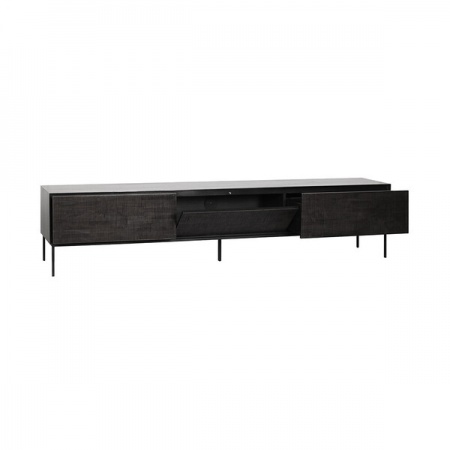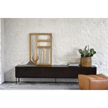 Chaque ligne du meuble TV Grooves est sculptée à la main, ce qui rend chaque pièce vraiment unique. Les petites imperfections font partie de son histoire et renforcent son caractère. Le résultat est une surface légèrement différente à chaque fois, chacune avec son propre rythme et sa propre dynamique. Le magnifique teck teinté foncé continue à l'intérieur, où les étagères et les tiroirs contiendront vos objets les plus précieux. Ce meuble TV Grooves comprend 1 porte rabattable et 2 tiroirs. Fabriqué en teck massif teinté foncé avec une finition vernie et des pieds en métal noir. Dimensions: L242 cm x L45 cm x H53 cm. Couleur: Teck foncé