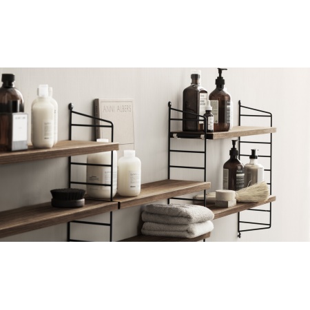 String pocket est vendu en kit de deux panneaux et trois étagères. Vous pouvez les combiner de plusieurs manières. Par exemple, avec deux kits, vous pouvez créer jusqu'à trois sections avec deux étagères chacune. L60 / P15 / H50cm.