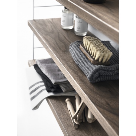 Les étagères s'intègrent dans les panneaux en acier et en plex de String® System si les étagères et les panneaux ont une profondeur de 30 cm. Créez une étagère monochrome ou mélangez des étagères de différentes couleurs et essences de bois. Chaque emballage contient trois étagères et supports. Dimensions : Longueur 78 cm x Profondeur 30 cm. Couleur : Noyer.