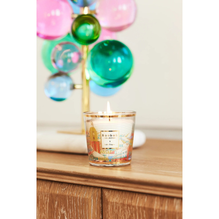 La bougie parfumée Baobab Collection à Saint Tropez est décorée d’une sérigraphie multicolore et or reprenant les toits des maisons de village et rendant hommage au mythique clocher.