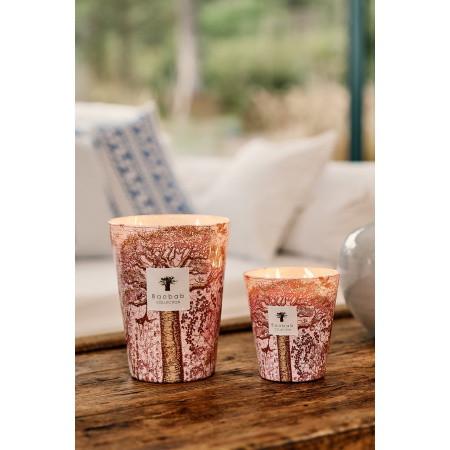 Sur le verre de la bougie parfumée Woroba, un grand baobab brun sur fond rose s’élève au milieu d’une savane rappelant la délicatesse de tissus anciens. Le dessin sur le verre est réalisé en Italie grâce à l’expertise de la sublimation. A travers le décor, on peut voir la flamme et celui-ci s’anime comme une lampe donnant vie à la bougie.