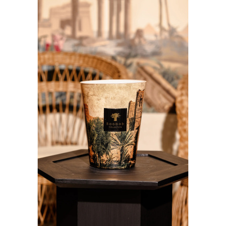 Hommage à la plus grande palmeraie du sud marocain, Skoura, qui s’étend sur 27 kilomètres de pistes, où palmiers, douars et kasbahs ponctuent ce territoire magique et majestueux. La kasbah immortalisée par Serge Anton devient presque château médiéval et le travail artistique du photographe s’exprime dans une finition à l’allure de papier grisé et vieilli. Des trois bougies de la collection Orientalist, Skoura est probablement celle qui touche au plus près ce traitement particulier d’une toile de musée.