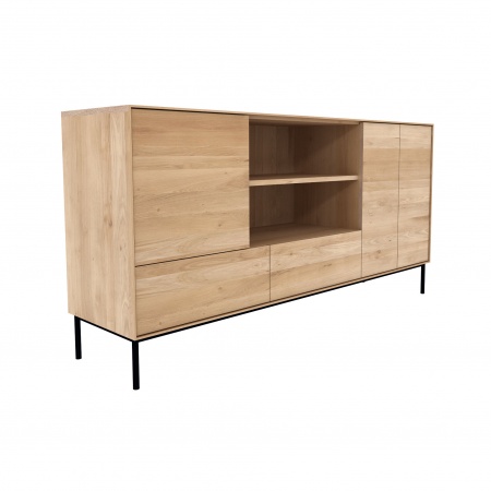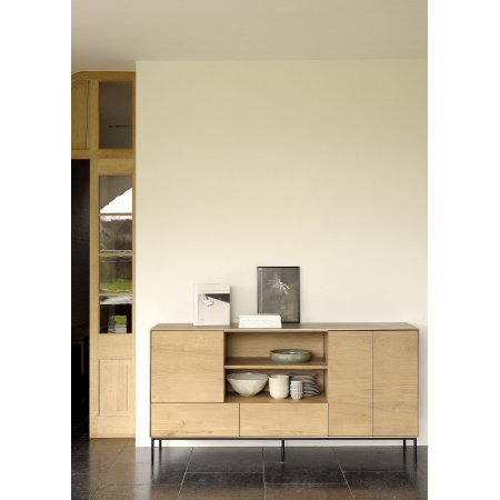 Pour sa collection Whitebird, le designer Alain van Havre rassemble des éléments opposés, combinant des pieds en métral ronds et doux et des lignes graphiques accrocheuses dans des designs légers et aérés. Ce buffet Whitebird comprend 3 portes et 2 tiroirs à ouverture par pression. Fabriqué en chêne massif avec une finition vernie et des pieds en métal noir. Dimensions: L150 cm x L45 cm x H85 cm.