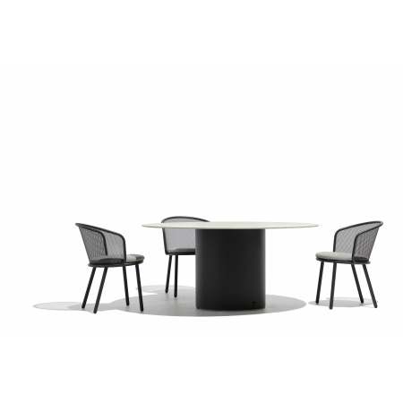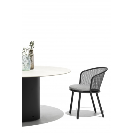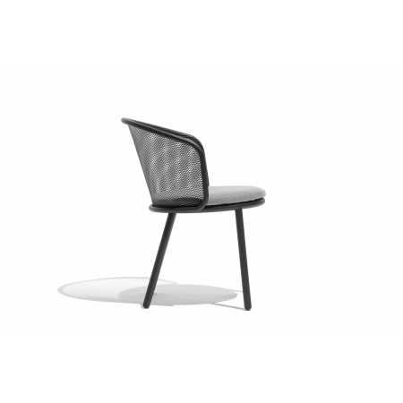 Chaise en acier inoxidable, metal déployé. Tissu A - 145/426. Crevin Vita est un tissu d'ameublement unique pour une utilisation conjointe intérieur-extérieur. Il a un aspect chaleureux et naturel et peut être facilement nettoyé à la machine à laver. Il est fini avec un traitement anti-taches et est livré avec une stratification imperméable. Designer: Studio Segers. Dimensions: 59x61x78 cm.