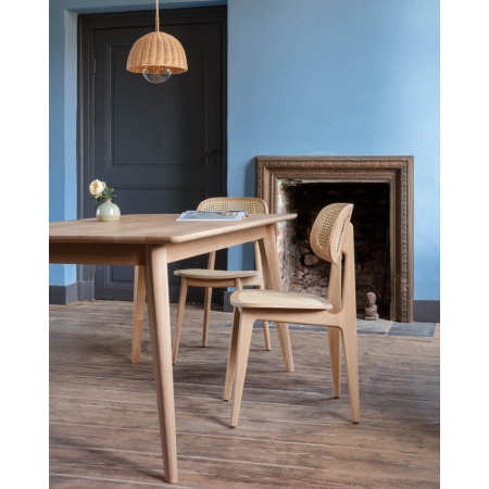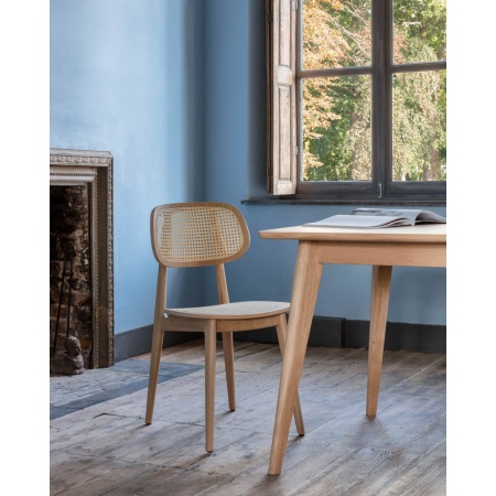 Une chaise de salle à manger raffinée avec cannage et une structure en chêne.
