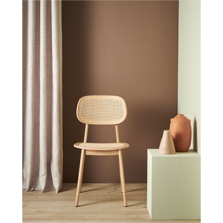 Matière: cannage | assise et dossier en placage de chêne | pieds en chêne massif. Patins glisseurs en nylon. Dimensions: H84 cm x L44 cm.