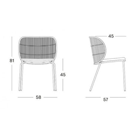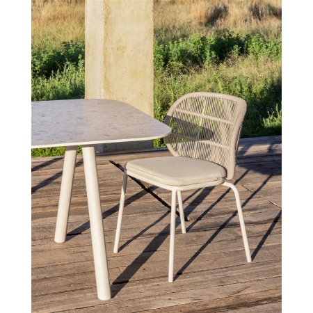 Une chaise pour votre table de jardin avec un dos arrondi et des courbes élégantes. Design de studio segers. Matière: corde polypropylène | cadre en aluminium thermolaqué coussinhousse amovible | coussin : remplissage mousse Quick Dry de 4 cm | coussin avec passepoil patins glisseurs. Patins glisseurs en nylon.