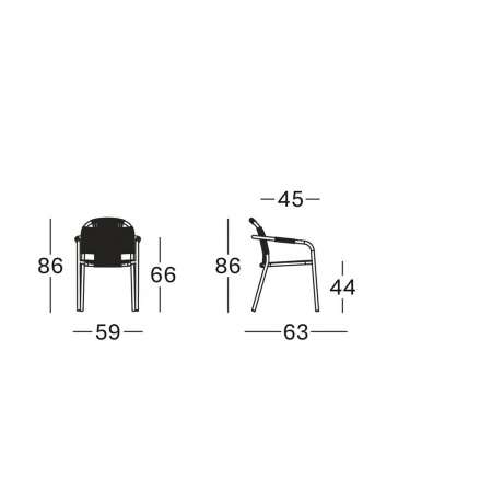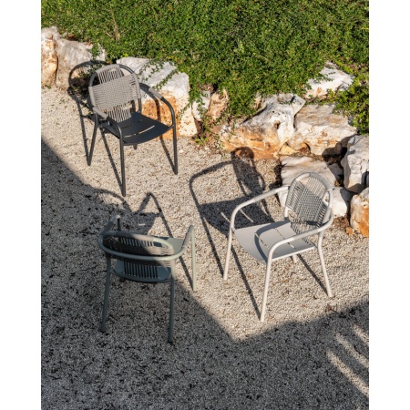 La chaise Cleo est une chaise d'extérieur légère et empilable. Le profil mince de Cleo est constitué de deux parties en aluminium. L'une d'elles forme l'arche du dossier tandis que l'autre s'étend autour du dossier pour devenir l'accoudoir. Une corde en polypropylène tissé crée le dossier caractéristique de la chaise, tandis qu'elle est également utilisée autour des accoudoirs pour un degré de confort supplémentaire. Matière corde polypropylène | cadre en aluminium thermolaqué , patins glisseurs en nylon. Dimensions: H86cm x L59cm x P45cm.