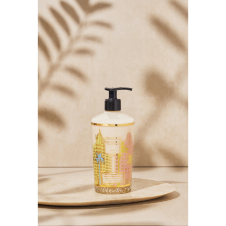 Conditionnée dans un verre décoré d’une sérigraphie d’or et de couleurs pastels représentant les immeubles art déco de South Beach. La lotion corps et mains parfumée Miami se place dans les salles de bains tel un objet de décoration. On aperçoit à travers le verre la texture de la lotion délicatement colorée jaune pâle laissant ressortir le décor stylisé. A la fois légère et hydratante, la lotion s’applique sur le corps comme une seconde peau, un moment de douceur intime et réconfortant.