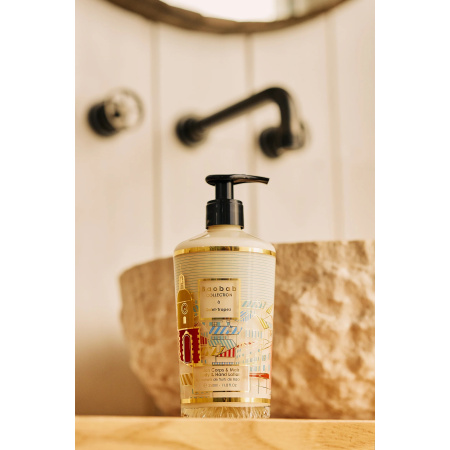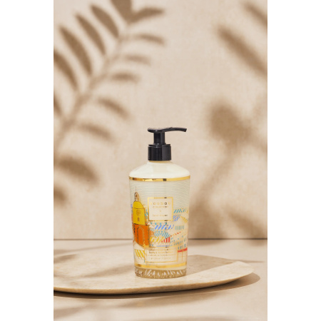 Le mythique village de Saint Tropez est représenté d’une façon stylisée sur le verre grâce au décor sérigraphié d’or et de couleurs. La lotion corps et mains devient un objet de décoration et l’on aperçoit en transparence la galénique délicatement colorée. La texture de la lotion est légère et s’applique comme une seconde peau dans un effet hydratant frais et réconfortant.