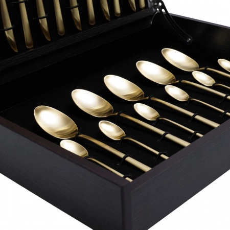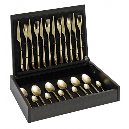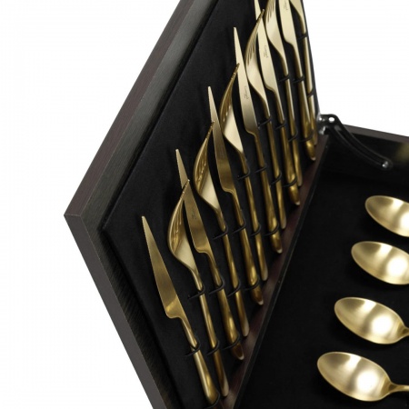 Coffret CUTIPOL pour un set de couverts de 24 pièces : 6 fourchettes de table, 6 couteaux de table, 6 cuillères de table et 6 cuillères à thé, adaptables sur tous les modèles Cutipol. Matériau : bois.
