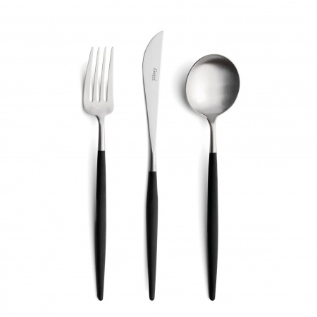 La parfaite symbiose de l'Occident et de l'Orient dans des pièces ergonomiques et délicates qui inspirent des gestes uniques. Matière : inox brossé mat 18/10 et manche en résine disponible en différentes couleurs. Conception : José Joaquim Ribeiro. Couleur : Bleu. Le set GOA contient 24 couverts : 6 fourchettes de table, 6 couteaux de table, 6 cuillères à soupe et 6 cuillères à café.