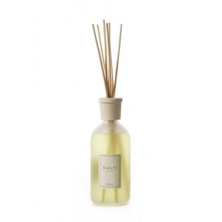 Bouteilles en verre avec étiquettes couleur ivoire et bouchon en bois d’érable naturel. Le caractère esthétique de la ligne CULTI STILE évoque la pureté et l’élégance.Tessuto: La fraîcheur du lin et le bruissement de la soie. Un parfum unique, créé à Côme en hommage aux fibres les plus précieuses et naturelles. Son parfum omniprésent est « tissé » de bergamote, de fleurs de cassis et de feuilles de coton, menant à un cœur de jasmin et se refermant sur un fond propre de musc blanc.