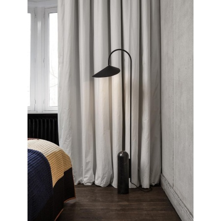 Le lampadaire Arum se caractérise par la base en marbre massif noir combinée à l'abat-jour de forme organique. Atteignant l'équilibre parfait dans la structure excentrée de la lampe, le pied en marbre noir contrebalance la manière douce dont l'abat-jour est suspendu à la voûte métallique incurvée à la manière d'une feuille. Avec l'intérieur mat et blanc cassé de l'abat-jour, la lampe fournit une lumière douce et uniformément répartie, et l'abat-jour peut être ajusté pour assurer des conditions d'éclairage optimales dans toutes les situations. Ampoule E14 non fournie. Cordon en tissu noir de 2,6 mètres. Dimensions: L25,6 cm x L41,9 cm H136 cm. Couleur: Noir.
