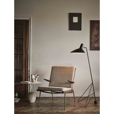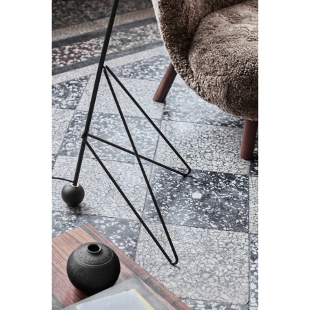 Le lampadaire tripode, reflète le minimalisme des grands designers Hvidt & Mølgaard. Ce lampadaire en métal laqué rehaussé de détails en laiton interpelle par l’association de ses lignes d’une grande simplicité et d’un piétement aux courbes élégantes. Bien qu’initialement créé en 1953, c’est la première fois que le modèle est édité. L’abat-jour est formé au repoussoir à partir d’une seule pièce d’aluminium. La base est faite de tubes de métal soudés les uns aux autres, le tout recouvert d’une laque de finition satinée.Dimensions: H134 cm x P63 cm Couleur: noirDesigner: Hvidt & MølgaardSource lumineuse et ampoule: E27 Max 60 Watt, 220-240V, ampoule non fournie Matériaux: métal laqué et câble d’alimentation tissu 2 mètres avec interrupteur marche/arrêt