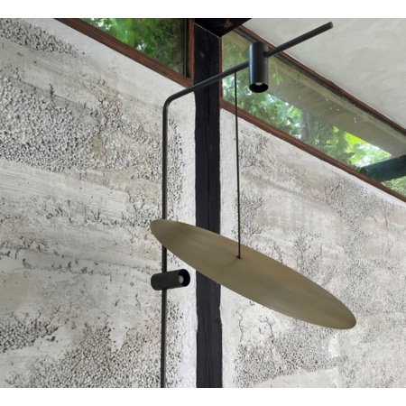 The moon Floor lamp est un lampadaire minimaliste construit à partir de formes géométriques, où chaque composant est parfaitement équilibré entre eux. La lampe a deux sources de lumière placées comme points de fixation de composition le long d’un bras en laiton oxydé. Un grand abat-jour circulaire est suspendu au bras comme un réflecteur flottant dans l’espace. L’abat-jour en laiton brossé est éclairé des deux côtés, créant un éclairage chaud et doux. La lampe Moon est montée sur une base cylindrique de marbre gris non poli, stabilisant la structure.