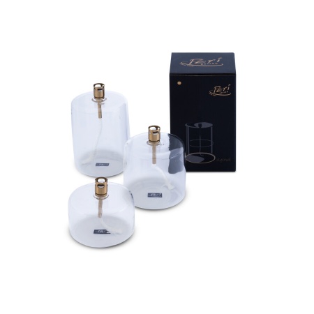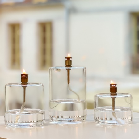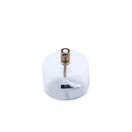 Lampe à huile cylindre en verre et laiton, mèche en fibre de verre. Dimensions D8 cm x H5,5 cm, taille S. Utiliser avec l'huile de paraffine Peri vendue séparément (référence 2221).