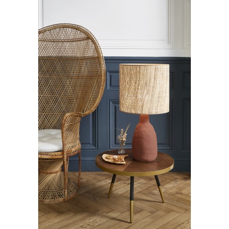 Lampe en céramique mat. Abat-jour forme cylindre en bana et raphia. Dimensions: D38 cm x H77 cm. Poids: 2,1 kg. Ampoule: E27, puissance 60W.