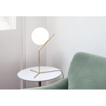 Lampe de table à lumière diffuse. Structure en laiton, brossé et verni transparent ou acier chromé. Diffuseur opale en verre soufflé. Variateur sur le câble d'alimentation. Ampoule non incluse, tension max 220-240V, puissance max 60W. Designer: Michael Anastassiades.