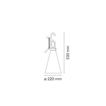 Lampe baladeuse. Diffuseur conique en polypropylène opalin moulé par injection. Poignée qui sert également à enrouler le câble, en polypropylène moulé par injection. Bouton interrupteur sur la poignée recouvert d’élastomère moulé par injection. Ampoule non incluse, tension max 220-250V, puissance max 60W. Existe aussi en orange. Designer: Konstantin Grcic.