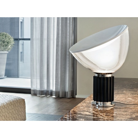 Lampe de table à lumière indirecte et réfléchie. Réflecteur en aluminium peint blanc laqué sur la face externe et blanc mat sur la face interne. Diffuseur orientable en verre transparent soufflé. Corps en aluminium extrudé peint noir mat ou anodisé naturel. Base en ABS+PC nickelée. Câble électrique longueur utile 190 cm, avec interrupteur variateur permettant la fonction ON/OFF et le réglage du flux lumineux 10-100%. Bloc alimentation sur prise avec fiches interchangeables.