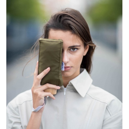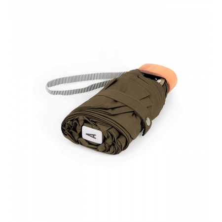 Mini-parapluie kaki. Optez pour le parapluie pliant si vous cherchez un parapluie pratique et résistant. Caratérisques : poids : 220g. Baleines : 7 baleines en fibre de verre et aluminium avec renforts en carbone. Ouverture et fermeture manuelle. Toile : tissu microfibres 190 microfils. L'attache est un bouton pression métal gravé. La poignée est en bois (érable). Dimensions : Longueur fermé : 17, 5cm ; Diamètre ouvert : 84 cm.