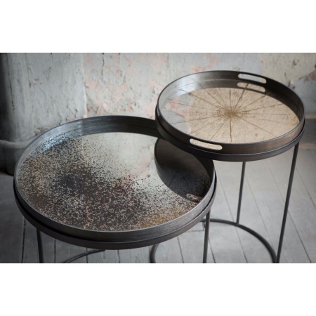 Plateau rond miroir vieilli clair et sérigraphié, avec bord en bois.La collection de plateaux Ethnicraft est inspirée par la nature et les voyages et se traduit par une palette de couleurs tamisée rencontrant des motifs captivants. Chaque plateau est fait à la main, ce qui rend le produit unique. Dimensions: D48 (taille S) Couleur: Transparent Designer: Dawn Sweitzer