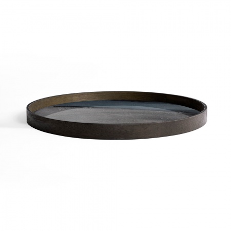 Rappelant le mouvement du lit d'une rivière et les métaux réfléchissants, le mouvement organique rencontre des formes linéaires dans la collection de plateaux Linear Flow. Inspiré par les dessins à l'encre au début du processus de conception, lorsque le pigment frappe le verre, il prend une vie remarquable. Des effets complémentaires se révèlent de manière inattendue. Plateau en verre peint à la main avec bord en bois. Dimensions: D61 cm x H4 cm. Motif: Ink Linear Squares. Designer: Dawn Sweitzer.
