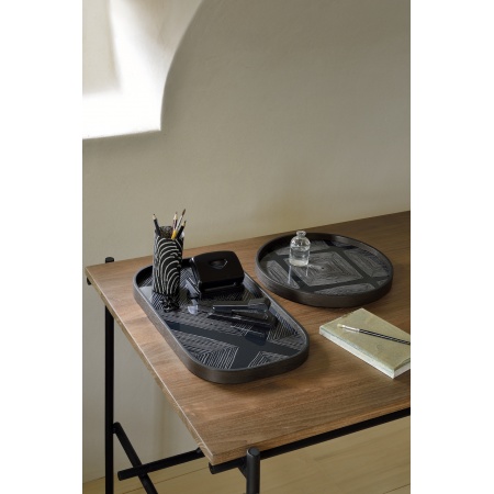 Le mouvement organique rencontre les formes linéaires dans la collection de plateaux Linear Flow. Inspiré par les dessins à l'encre au début du processus de conception, lorsque le pigment frappe le verre, il prend une vie remarquable. Des effets complémentaires se révèlent de manière inattendue, où des motifs linéaires dessinés et peints à la main génèrent une finition vraiment distinctive. Verre sérigraphié - bord en bois. Dimensions: D30 cm x H3 cm. Poids: 1 kg.