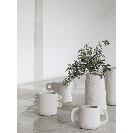 L'amour immodéré pour le papier et les imprimés, tout comme la volonté de réemployer des matériaux, a poussé Marie Michielssen à créer une série de lampes et de pots caractéristiques en papier mâché. Jouant avec les volumes, elle imagine un nouvel imprimé visuel. Par l'ossature présentant une structure linéaire savamment pensée, les rais de lumières trouvent leur chemin par les ouvertures. Le caractère artisanal unique se constate non seulement dans les imprimés, mais également les formes et les couleurs.Dimensions: D22 cm x H23 cm. Couleur: Beige.