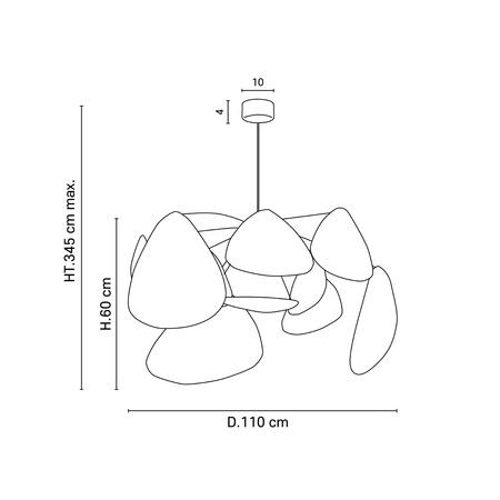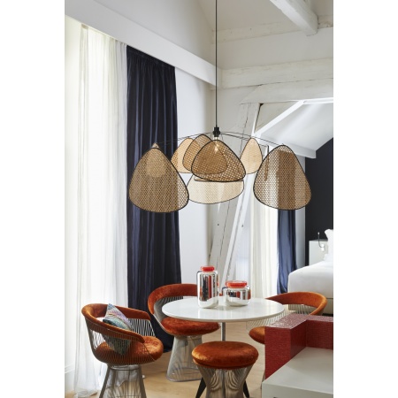 Suspension XL esprit mobile. Structure en métal peint, 10 écrans en cannage bordés en tissu. Équipée d’une cordelière textile et d’un pavillon en métal adaptable DCL. Dimensions: D110 cm x H60 cm. Hauteur totale: 345 cm. Poids: 2 kg. Ampoule: E27. Puissance: 60W.