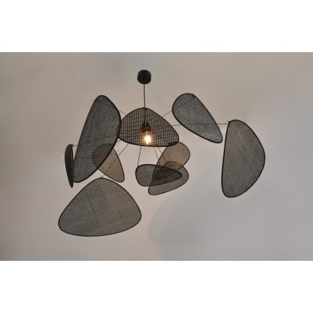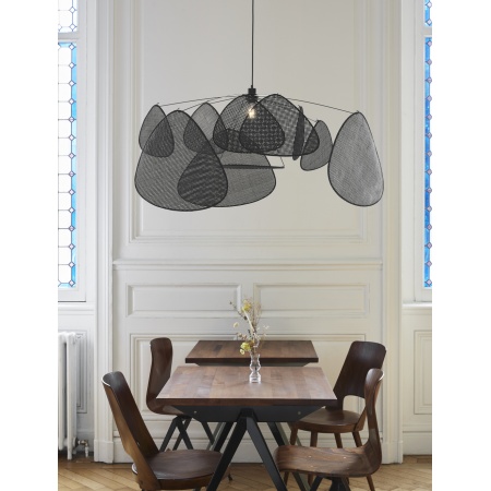 Suspension XL esprit mobile. Structure en métal peint, 10 écrans en cannage bordés en tissu. Équipée d’une cordelière textile et d’un pavillon en métal adaptable DCL. Dimensions: D110 cm x H60 cm. Hauteur totale: 345 cm. Poids: 2 kg. Ampoule: E27. Puissance: 60W.