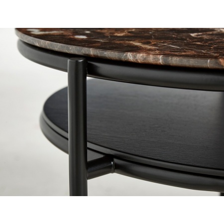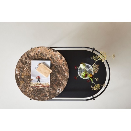Les lignes élégantes du miroir Verde ont été intégrées dans cette table basse. La construction métallique de forme ovale est conçue avec deux dessus de table. Le bas en placage de chêne peint en noir et le plateau circulaire en marbre. L'espace créé entre les deux plateaux est idéal pour les fleurs et les plantes, ce qui a été l'idée centrale du designer Rikke Frost lors du dessin des lignes de la série Verde. Verde vous permet de vous rapprocher de la nature et de créer de l'espace pour un environnement vert à l'intérieur de votre maison. Dimensions: L60 cm x L106 cm x H41 cm. Couleur: Noir/Marron. Designer: Rikke Frost dirige son propre studio de création à Aarhus basé sur la simplicité nordique depuis 2014. Avec un amour profond pour les matériaux assortis et une grande attention aux détails, Rikke Frost crée des designs qui doivent être vus, ressentis et touchés. Elle a été l'une des premières créatrices à faire équipe avec WOUD et avec une vision partagée, elle fait depuis une grande partie du collectif de créateurs.