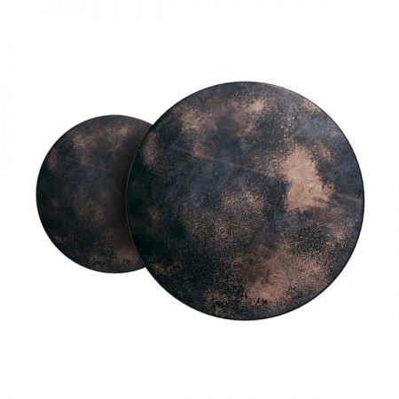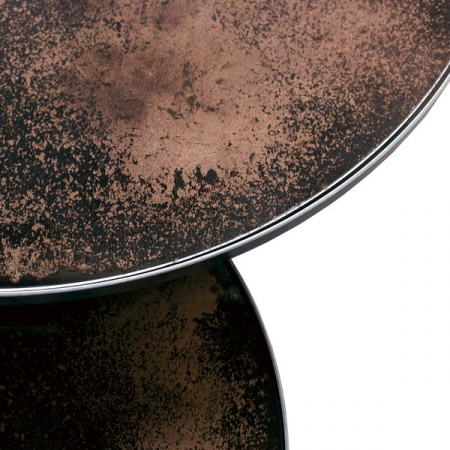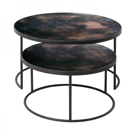 Ensemble de 2 tables basses gigognes en bronze et cuivre. Cet ensemble de tables basses gigognes capture la beauté de votre environnement sur sa surface réfléchissante. Les miroirs vieillis lourds dégagent des vibrations vintage, tandis que son cadre en métal noir vous ramène aux temps modernes. Designer: Dawn Sweitze. Dimensions: D: 92 cm x H: 41 cm / D: 26 cm x H: 24 cm.