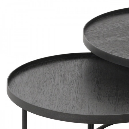Les tables- plateaux font parti des pièces les plus polyvalentes d'Ethnicraft: bien qu'elle remplisse sa fonction de table basse, sa capacité à adopter différents plateaux vous permet de mélanger ou d'assortir différentes couleurs et motifs, créant une pièce personnelle qui vous est unique. Vendu par lot de 2 tables. A combiner avec un petit et un grand plateau rond. Plateaux à commander séparément. Structure en métal noir - bois teinté noir. Dimensions: Taille S : D: 49 x H: 31 cm/ Taille L : D: 62 x H: 38cm. Couleur: Noir. Designer: Dawn Sweitzer.