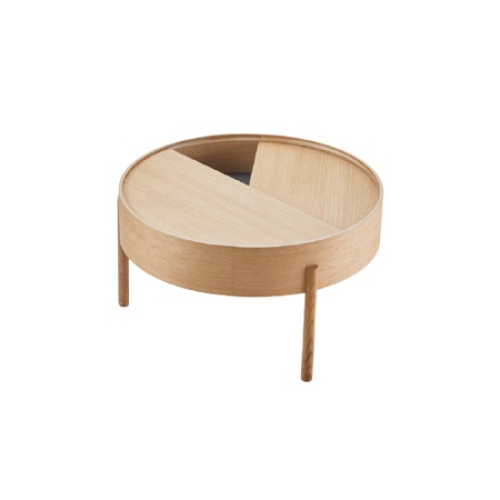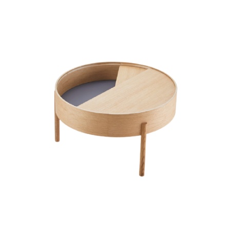 ARC tire son nom du concept mathématique d'une courbe lisse joignant deux points dans un cercle. La table ARC invite son utilisateur à utiliser les fonctionnalités simples. Utilisez un doigt pour tourner le plateau supérieur. Laissez-le être ouvert avec vos objets préférés exposés ou fermez le couvercle pour cacher votre désordre. En tournant simplement la moitié du couvercle circulaire, l'expression de la table est toujours changeante. La surface de l'espace de rangement intérieur est peinte dans une couleur gris foncé lisse pour compléter le bois de chêne tandis que la construction à trois pieds ajoute une touche ludique et légère à la conception de forme géométrique. Conçu par Julie Begtrup et Ditte Vad Les deux talents du design danois ont étudié ensemble et ont constaté qu'ils partageaient le même sens esthétique, la même vision des matériaux et des expressions dans leurs créations. Avec la conviction que les concepteurs ont la possibilité d'améliorer l'environnement, ils visent à créer des designs honnêtes et fonctionnels qui permettent une interaction dynamique entre le design et son utilisateur. Dimensions : D: 66 cm x H: 38 cm.