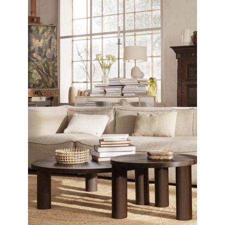 La table basse Post joue avec les volumes pour présenter une table basse simple et ronde avec des détails complexes qui vous attirent. Fabriquée à partir de bois certifié FSC™, la table a trois pieds cylindriques robustes. Le plateau présente un élégant lambris unique en placage de chêne en forme de secteurs sphériques, réalisés par une technique connue sous le nom de marqueterie. Utilisez plusieurs tables de différentes tailles pour créer un paysage cohérent à deux niveaux. Couleur : Chêne fumé. Dimensions : Ø: 100 x H: 33.4 cm. Matériau : placage de chêne fumé avec âme en MDF. Certifié FSC™ Mix. Conseils d'entretien : essuyer avec un chiffon humide.