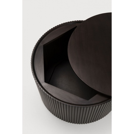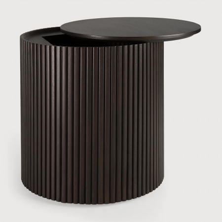 Conçue par Jacques Deneef, la table d'appoint ronde Roller Max est un astucieux objet multifonction qui réunit une table avec un rangement. Le plateau, qui se loge dans le volume rainuré du pied, est facilement amovible pour vous permettre de dissimuler les journaux, jouets, coussins ou plaids du quotidien. Une solution idéale pour les petits espaces. Forme : Ronde. Couleur : Brun foncé. Le plateau est amovible et dévoile un espace de rangement dans le pied de la table. Matériau : Acajou teinté brun foncé avec finition vernie. Dimensions : Diamètre : 40 cm x Hauteur : 40 cm. Poids net : 7.45 kg. Tous nos produits sont fabriqués à la main, les modèles peuvent donc varier légèrement d’une pièce à l’autre. Nous considérons que c’est la marque d’un objet unique. Aucun montage nécessaire. Nous vous recommandons vivement d'utiliser des sous-verres. Si vous renversez quelque chose, nettoyez immédiatement.