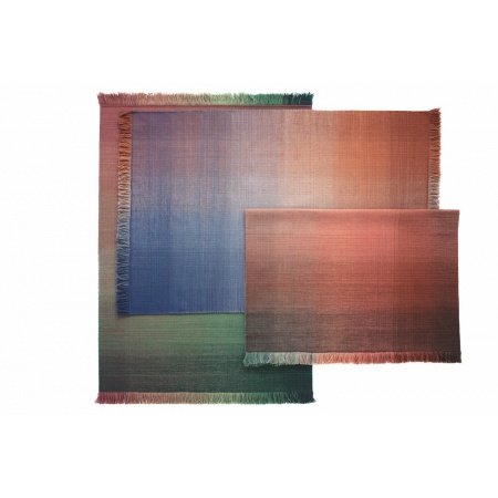 La collection Shade s'inspire des moments magiques de la nature où les couleurs se fondent et parlent d'elles-mêmes. Le designer Begüm Cana Özgür souligne: qu'«il s'agit d'un tapis tissé à la main qui génère une diffusion de couleur incroyable et bien équilibrée. La surface libère un sentiment de tranquillité et de bien-être qui est équilibré par la vibration pénétrante des couleurs. » Cette collection d'une simplicité exquise reflète un processus technique complexe pour atteindre la densité, la régularité et la fluidité de l'effet souhaité. Deux gradients convergent dans chaque tapis, un vertical et un horizontal, dans le même plan, en utilisant harmonieusement six teintes de transition. L'ombre est disponible en quatre palettes ombrées: du turquoise à l'aubergine, du roux au bleu Klein, de la framboise au vert forêt et du gris au grenat brunâtre. Dimensions: L200 cm x L300 cm. Couleur: Palette 1. Designer: Begüm Cana Özgür