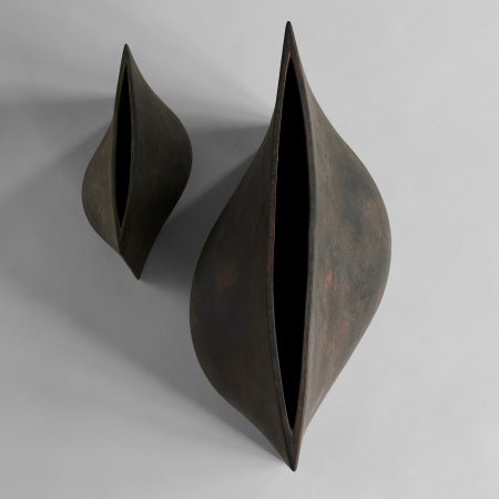 "Les vases Origami s'inspirent de l'art traditionnel japonais du pliage du papier. Les vases imitent deux morceaux de papier pliés l'un vers l'autre, ajoutant un contraste raffiné entre les surfaces nettes et douces.Origami est fabriqué à partir de céramique et est disponible en deux tailles.