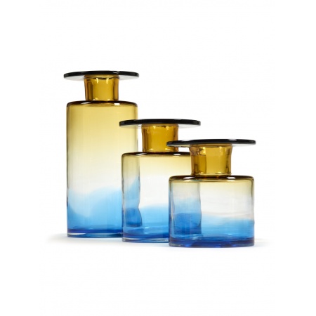 La nouvelle collection Wind & Fire comprend les traductions en verre des vases organiques Earth en papier mâché d'une part, mais des formes complètement nouvelles ont également été ajoutées à la collection. Des vases rappelant les pots de pharmacie d'antan. Les versions organiques en marron, vert et bleu foncé, le plus serré en bleu céleste et cognac. "La transition entre ces deux couleurs rappelle la transition entre mer et plage", explique Marie. Dimensions: L18.5 x L18.5 x H40 cm. Designer: Marie Michielssen.